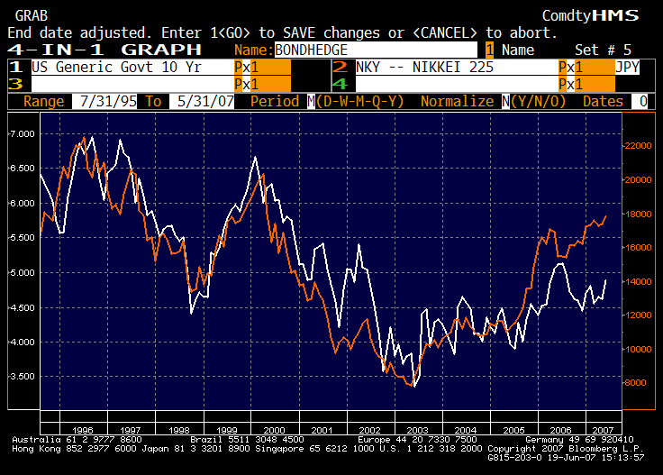 After more than ten years of happy union, an intriguing correlation between the US 10 years government bonds yield and the Nikkei 225 equity index seems to have come to an end.