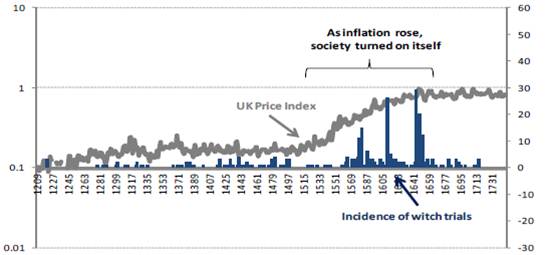 British witch trials peaked with the medieval price revolution (price index in logs)