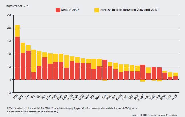 To have a broader basis for comparison you can have a look at the chart below, which shows the evolution of government debt for the OECD from 2007 to 2012. If we exclude Norway, which enjoyed a free rent from the oil boom, Switzerland and Sweden are the two economies that really stand out.