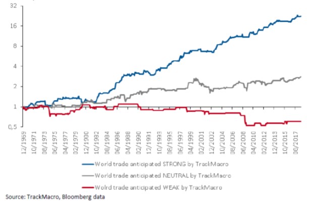 Chart 1. MSCI World return when world trade is anticipated strong, neutral, or weak by TrackMacro