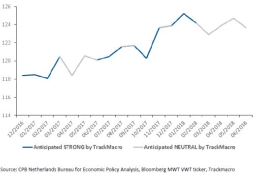 Chart 2. World trade in volume and TrackMacro’s anticipation in 2017 and 2018