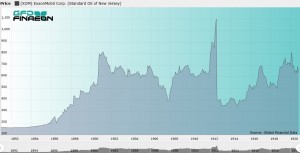The shares moved up between 1895 and 1901 as Standard Oil established its control over the oil market. Its decline during the Panic of 1907 and recovery thereafter, as well as the strong move up to 1100 in the year following the decision of the Supreme Court are plainly visible. The collapse from 1100 to 400 occurred when its subsidiaries were spun off.